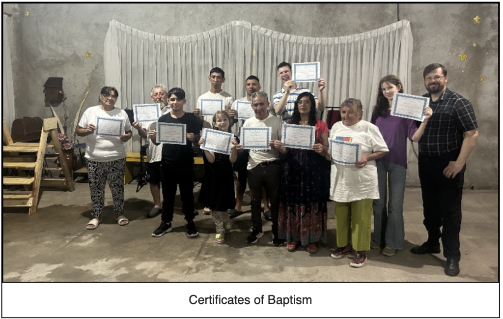 One of the needs that we had to prepare for before the baptism service was having robes made.  I understand that it is not a scriptural mandate to have a robe, but having robes solves a lot of problems.  For one it helps greatly with reference to modesty.  In the neighborhood where we are working, some do not have extra clothes for changing into afterwards.  It is common for people to want to wear white for the baptism symbolizing purity in the culture.  You can imagine the problem of people wearing white clothes coming out of the water without a robe!  It turned out to be an excellent decision!  It not only helped logistically as well as providing great group photo but it also provided us with the opportunity to visit the family in Malvinas Argentinas where we previously had a Bible Study a few years back. The wife is a seamstress and did an amazing job.  She made 15 robes in just two days!  Pray for them as they are currently not attending anywhere but have expressed a desire to fix that area of their lives.  Also, we are now ready with good robes for future baptismal services.