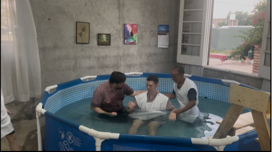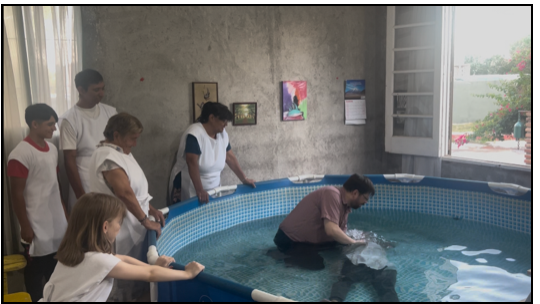 The day before the baptisms there was a water line break which resulted in a pool full of mud!  Early Sunday morning Marcelo sent me the picture of the muddy pool.  We had the baptisms planned for 7:00 in the evening!  It took the whole day but Marcelo and his family were able to clean the pool and have it sufficiently filled in time.  It was the first time for me to baptize a person sitting all the way down.
